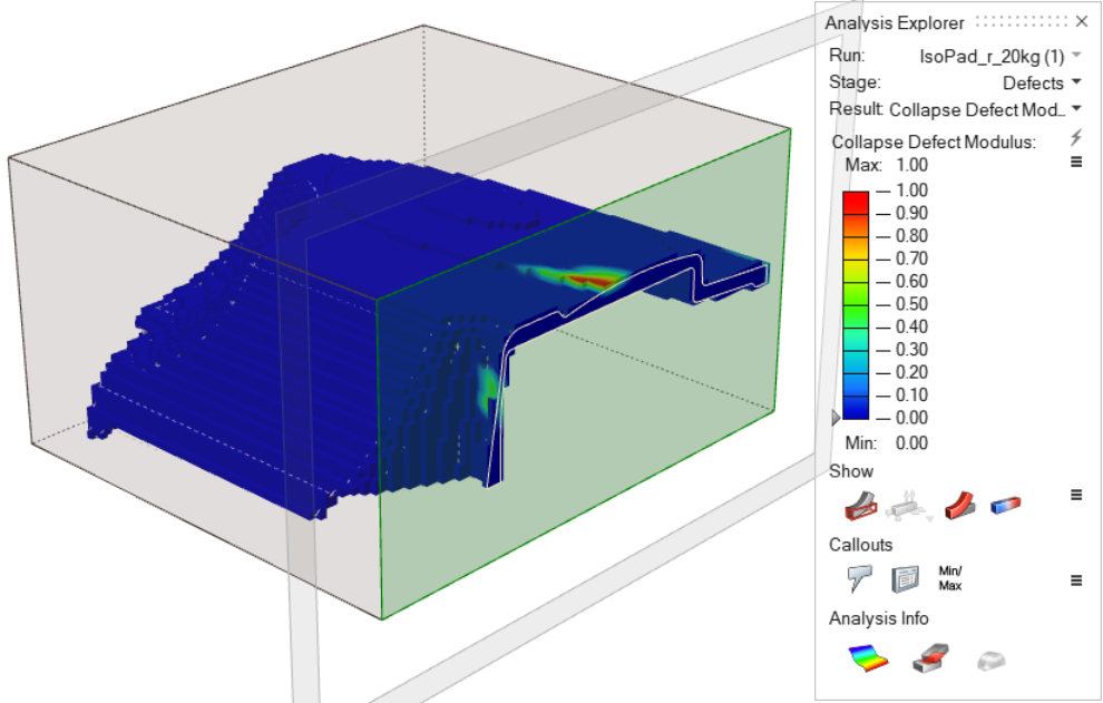 Review a range of defects that can occur at the end of the foaming process. Result types for this stage include: Air Pressure, Filling Time, Surface Defect Modulus, Shrinkage Defect Modulus, Weld Lines, and Weld Lines Movement.
