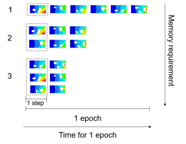 Within an epoch, batches of data are passed to the learning model in a series of steps. Each single piece of data will be in only one step during each epoch. In each epoch, the data is randomly shuffled into steps. Figure 8 illustrates a training with six data points (A-F) to compare the effect of batch size. When the batch size is two, each epoch contains three steps and requires six overall steps in the two epochs. In contrast, when the batch size is three, each epoch contains two steps and requires four overall steps in the two epochs. Using a batch size of three requires less overall steps, but at the expense of larger memory requirement to load the batch into memory. The optimal batch size depends on the problem being solved and can truly be determined through trial and error.