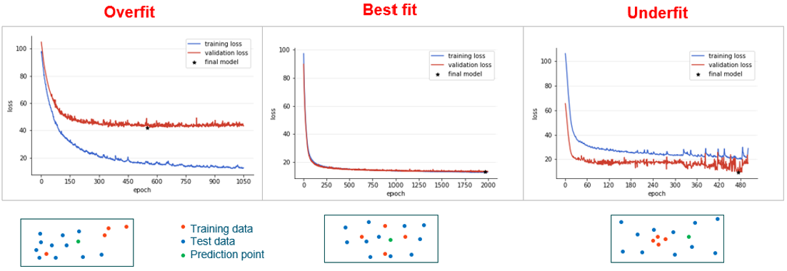 - If the validation loss is much higher than the training loss, then the model is overfit to the training data. This implies that the model is not generic enough for the design space. This could possibly be due to a small or skewed dataset.