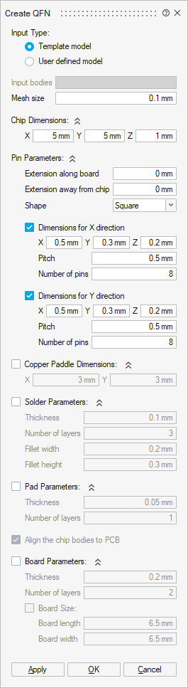 This tool enables easy creation of Quad Flat Non-Leaded (QFN) with its associated components, such as solder, pad, and board bodies. It supports both CAD and mesh bodies as input.