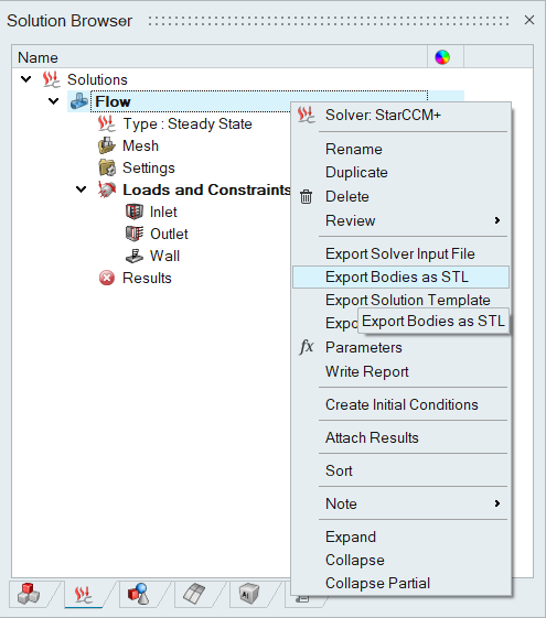 The bodies used in the solution can be exported as multiple STL surface mesh files. Each body in the solution will be written as an STL file. This can be done by right-clicking on the solution and selecting “Export Bodies as STL”.
