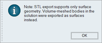 If volume mesh bodies are present in the solution, only the surface mesh (definition) of those bodies will be exported as part of the STL output. The below message indicating this behaviour will be posted.