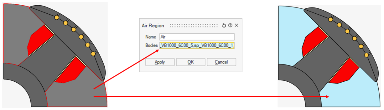 Assign bodies with air properties to the Air Region. Assign individually or in groups. If the Air Intercoil is selected, bodies turn light blue.