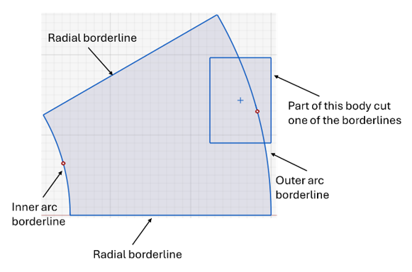 All bodies must be within the inner and outer radii of the part and the two radial borderlines.