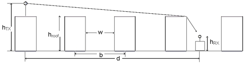 As described above, is length of the path between transmitter and current receiver location. p is the path loss exponent. The value of depends on the current propagation situation. In dense urban areas tends to be slightly higher than in open areas. In addition, depends on the breakpoint distance. After the breakpoint, increased path loss exponents are common due to distortions of the propagating wave. The function yields the loss (in dB) which is caused by diffractions. The diffraction losses are accumulated along one propagation path. Reflections and scattering are included empirically. For the consideration of reflections (and scattering), an empirically determined wave guiding factor is introduced. This wave guiding factor takes into account, that a wave propagating in a long street canyon will be reflected on the walls leading to less attenuation compared to free space. Thus, wave guiding effects can be expressed as an additional gain in dB. The directional gain of the antenna (in direction of the propagation path) is also considered.