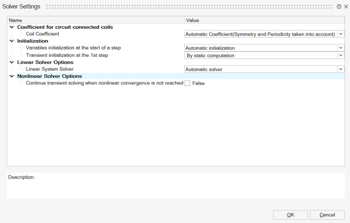 The Solver Settings allow the user to set the Flux solvers options which will be taken by Flux (in batch) to solve the current solution.
