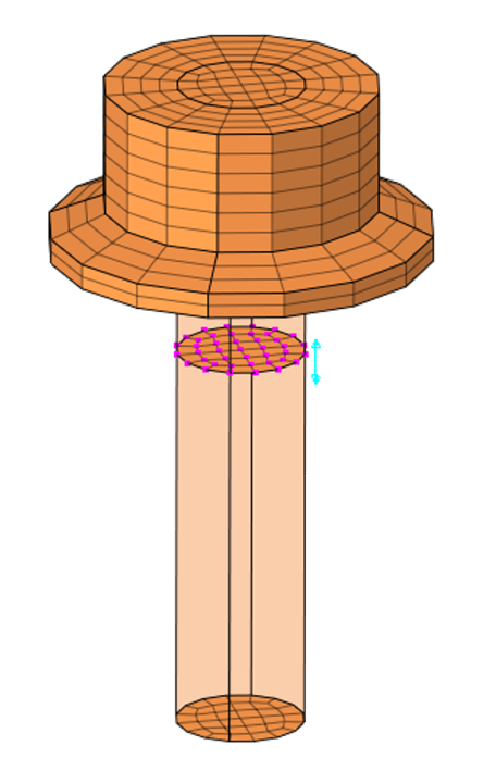 The pretension section can be created at a specified distance from the bolt or screw head. Pretension definitions can then be applied by specifying the pretension force and adjustment length.