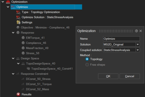 It is now time to define your Optimization Solution. In the Optimization Solution creation window, please select the Electromagnetic Solution defined at step 2. Then, please select as “Coupled Solution” the Structural Solution defined at step 3.