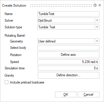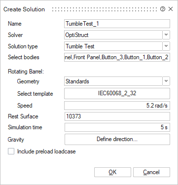 For simulations requiring the resolution of contact penetrations or the simulation of initial deformations, the “Include Preloading Loadcase” toggle should be enabled. This enables a preload subcase, which ensures proper handling of contact interactions and mechanical deformations before the tumble test begins.