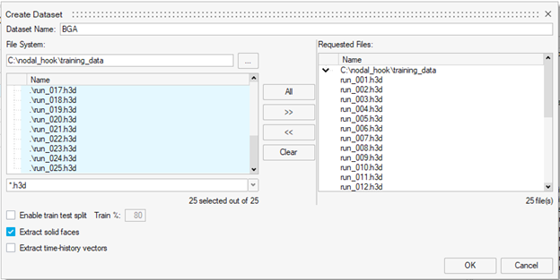 Inside the training_files folder, there are 25 .h3d files named run__00X.h3d and 25 .csv files named run__00X.csv files. Each .csv file contains a list of nodes and the values of the Three custom inputs (Interface Displacement in X, Y, Z directions) along with a header row.