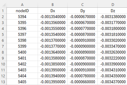 Note that only the nodes with one or more features defined on them are required in the .csv file. However, it is necessary that each node in the .csv file should have a value for all the input features. For example, if the node does not have any value defined and hence a value of 0 is used as a placeholder in columns DX, DY and DZ. In other words, the rectangular/tabular structure of the input data should be maintained.