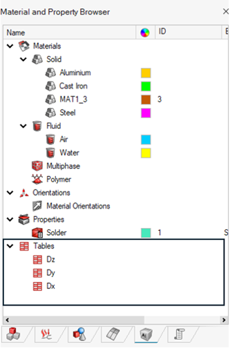 If custom inputs were defined during dataset extraction, these values are automatically stored as tables in the Material and Property Browser purely for visualization.