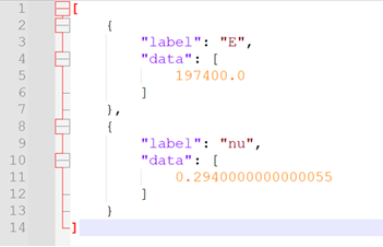 Inside the training_files folder, there are seven .h3d files named run__000X_m_1_fillet_cantilever_2.h3d and seven .json files named run__000X_m_1_fillet_cantilever_2_inp.json. Each .json file contains exactly two material properties, Young’s modulus and Poisson ratio with different values. It is necessary to have consistent labels and number of properties across all the samples.