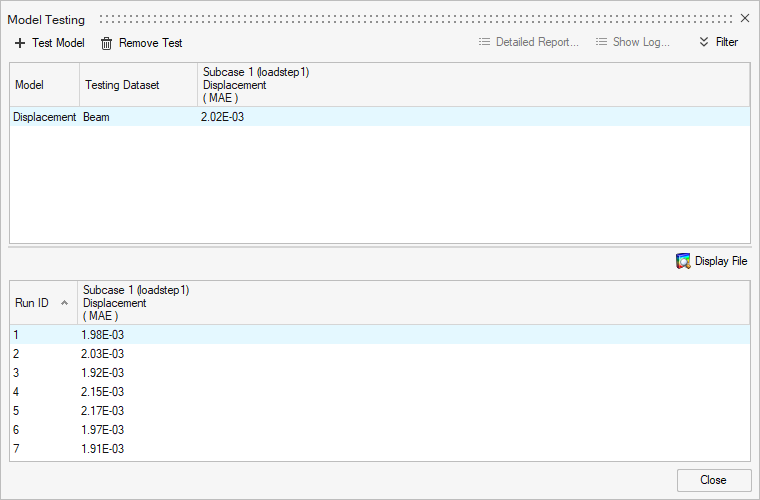 In the Model Testing dialog, select Displacement, and click Display File to view the results in the modeling window.