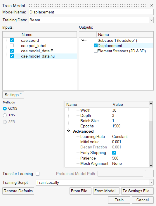 - For Inputs, select cae.coord, cae.model_data.nu, and cae.model_data.E.