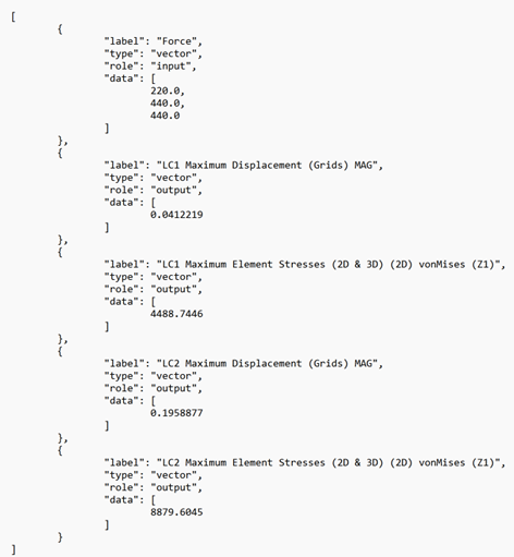 There are a total of 50 data samples. Each sample is composed of three files with matching names, each containing different information; the .h3d files containing the coordinates, part labels, and field results, and the .fem files, and the .json file containing the global vector inputs and outputs. An example .json file is shown in Figure 1. Note an additional attribute role, which distinguishes between input and output vectors. Also, each data needs to have a type attribute set to vector.