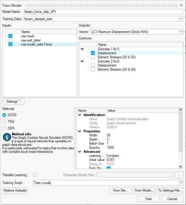Note:In the inputs section of the Train Model dialog, the mesh and part label are imported from the .h3d file, and the model_data.Force is the global vector input read by the hook. In the outputs section of the Train Model dialog, the contours are extracted from the .h3d file while the vectors are extracted from the .json file. While only the KPIs/vectors with the role attribute as input are displayed in the inputs section, all the vectors regardless of the role attribute are displayed in the output vector drop down.