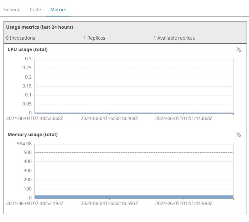 Once the Function is running, a new tab will appear to access the metrics of the Function. Here you can find usage metrics for the last 24 hours and information about the CPU and memory usage.