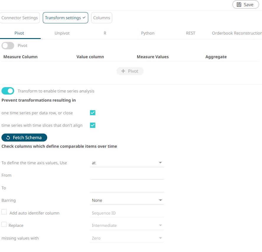 - Click the Transform Settings tab and enable Time Series Analysis. Click Fetch and make sure the parameter at is set as the define time axis value. Update the barring to Auto to standardize sparse time series, which is especially common with sensor data, outputting values at defined time intervals, and potentially minimizing the number of rendered data points.