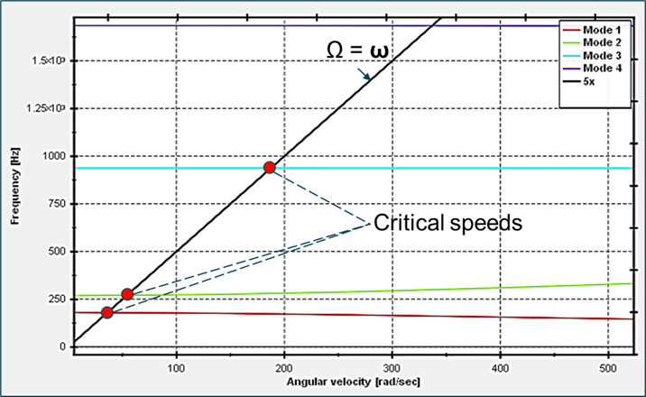 - 臨界速度は、固有振動数のラインがローター速度のライン(Ω = ω、すなわち1Xライン)およびその倍数成分(2Xラインなど)と交差するポイントとして特定されます。