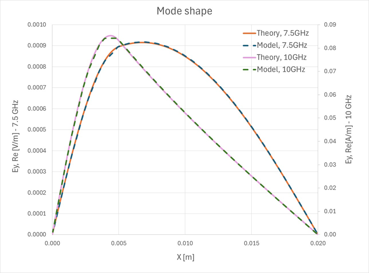 上記の電界分布の式を次のグラフで説明します(ここで、xは波の伝播方向に対して直行であり、サンプリングラインは、電界分布の最大を通っています):Figure 10. さまざまな周波数の基本モードにおける、理論上およびモデル化された電界分布の比較