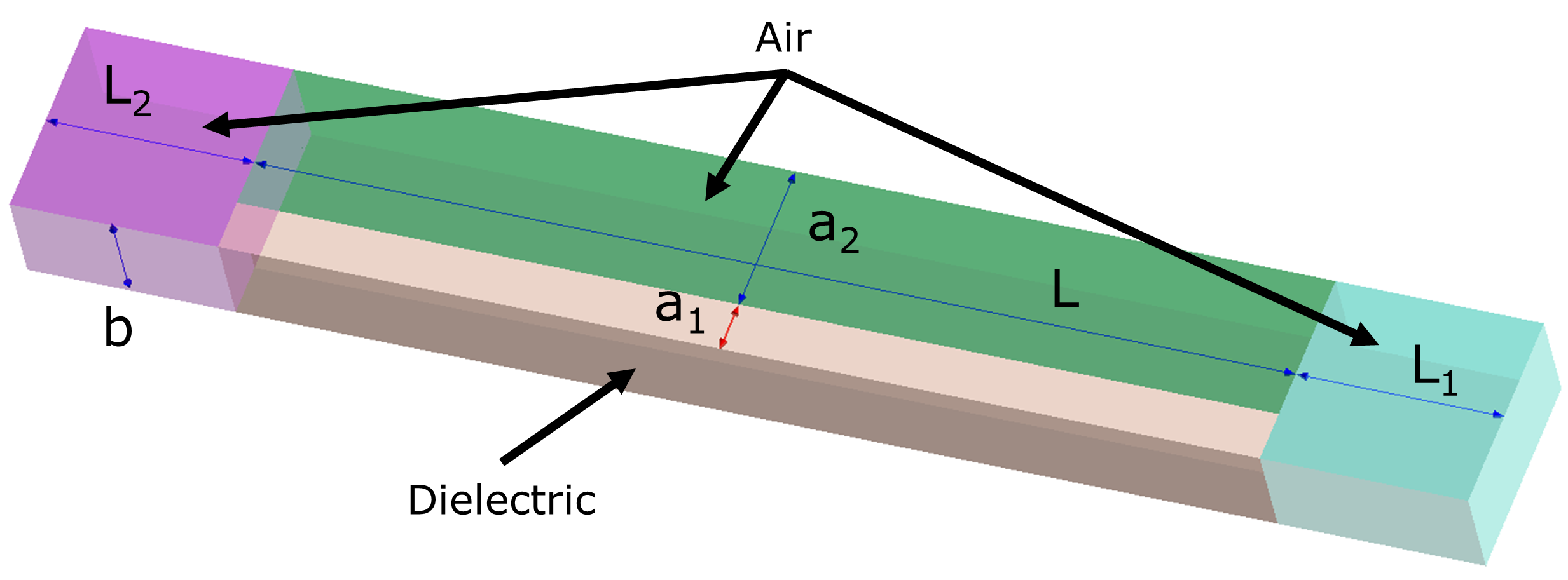 - Figure 1:a1 = 5mm、a2 = 15mm、a = a1 + a2、b = 10 mm、L = 100 mm、L1 = L2 = 20 mm