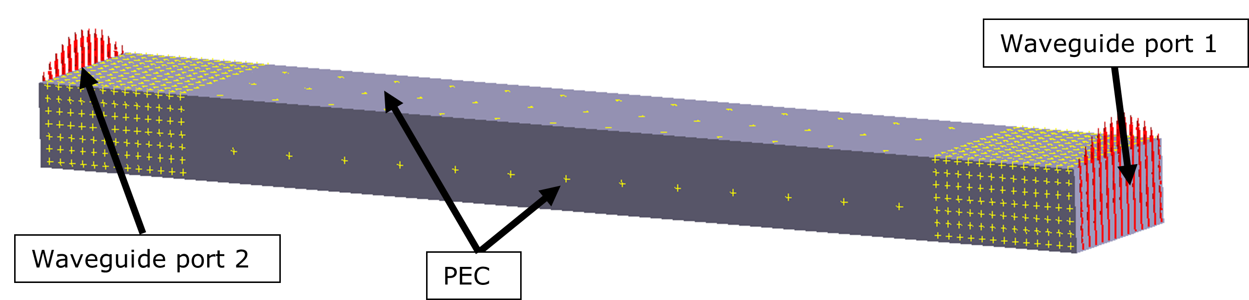 - すべての側壁はPEC(完全電気導体)条件とし、端面は導波管ポートとなります