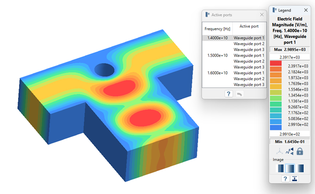 图例窗口会打开并显示云图。活动端口窗口将打开,显示提取的不同频率列表,选择波导端口使其处于活动状态。