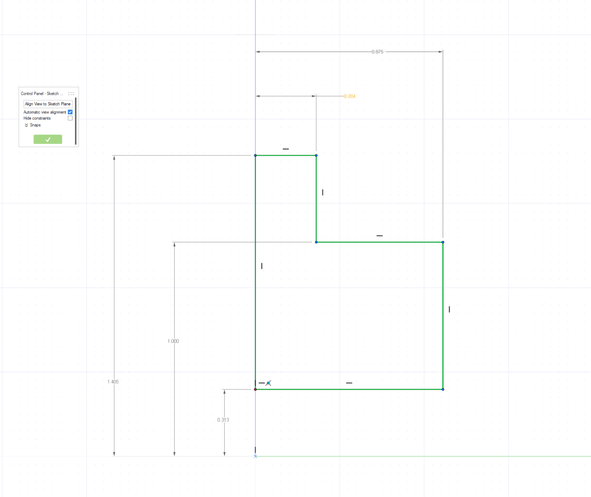 注: 詳細に定義されたスケッチが緑色で描画されます。スケッチを詳細に定義することは必須ではありませんが、お勧めします。場合によっては、スケッチを詳細に定義するために、原点のある水平制約または垂直制約が必要になることがあります。