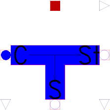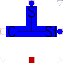 The component ConvergingTee is a specialized element that works only in a narrow boundary condition. It represents a 90° T-branch with equal diameter for main passage (sides c and st) and any diameter for branch s.