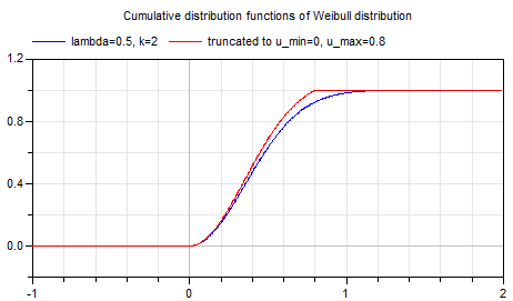 This function computes the cumulative distribution function according to a truncated Weibull distribution with minimum value u_min, maximum value u_max, scale parameter of original distribution lambda and shape parameter of original distribution k. The returned value y is in the range: