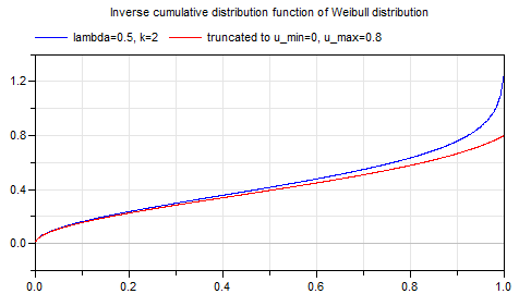 This function computes the inverse cumulative distribution function (= quantile) according to a truncated Weibull distribution with minimum value u_min, maximum value u_max, scale parameter of original distribution lambda and shape parameter of original distribution k. Input argument u must be in the range: