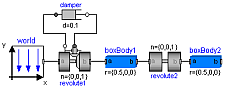 MultiBody 3-dim. mechanical systems consisting of joints, bodies, force and sensor elements. Joints can be driven by drive trains defined by 1-dim. mechanical system library (Rotational). Every component has a default animation. Components can be arbitrarily connected together. |