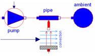 FluidHeatFlow, HeatTransfer Simple thermo-fluid pipe flow, especially to model cooling of machines with air or water (pipes, pumps, valves, ambient, sensors, sources) and lumped heat transfer with heat capacitors, thermal conductors, convection, body radiation, sources and sensors. |