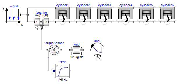 The Modelica schematic of one cylinderis given in the figure below. Connecting 6 instances of thiscylinder appropriately together results in the engine schematic displayedabove.