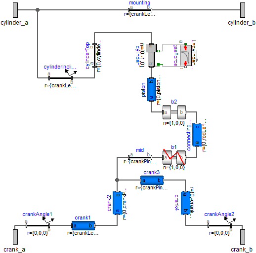 The usual remedy is to remove superfluous constraints,e.g., along the axis of rotation of one revolute joint. Since this isnot easy for an inexperienced modeler, the special joint:RevolutePlanarLoopConstraint is provided that removes these constraints.Exactly one revolute joint in a every planar loop must be replaced by thisjoint type. In the engine example, this special joint is used forthe revolute joint B2 in the cylinder model above. The icon of the joint isslightly different to other revolute joints to visualize this case.