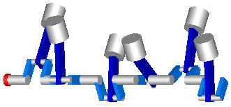 In the next figure the animation of the engine isshown. Every cylinder consists essentially of 1 prismatic and 2 revolutejoints that form a planar loop, since the axes of the two revolute joints areparallel to each other and the axis of the prismatic joint is orthogonal tothe revolute joint axes. All 6 cylinders together form a coupled set of 6loops that have together 1 degree of freedom.