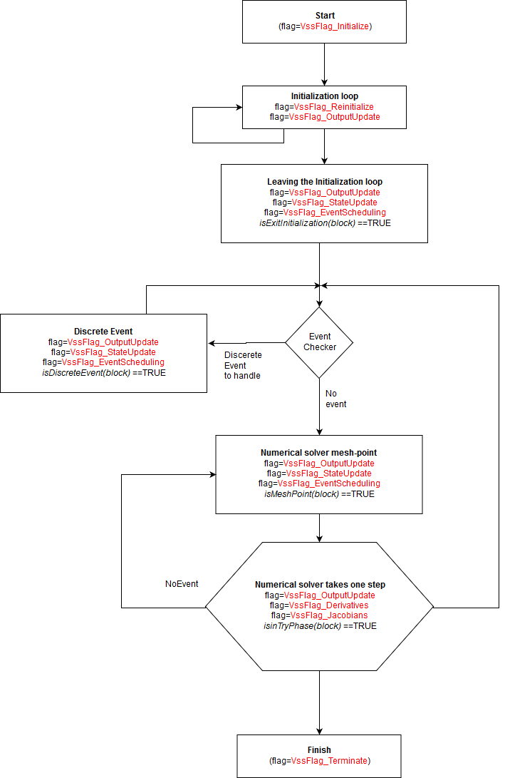 - VssFlag_Initialize: The block is called for the first time at the beginning of the simulation with this flag where initialization issues can be done. Operations such as opening data files, initializing a TCP/IP socket, or dynamic memory allocation can be done in this flag call. Although continuous-time and discrete-time states have already been initialized, they can be reinitialized (if needed). In this flag, input and output of the block are not available, and cannot be initialized or read. Each block is called with this flag only once at the beginning of the simulation.