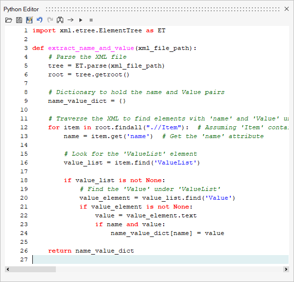 Pythonエディター Pythonエディターは、Pythonスクリプトの作成、編集、実行に使用します。 エディターはモデルやダイアグラムのコンテキストでも使用されますが、それらとは異なり、コードは自動的には実行されません。スクリプトを実行するには、実行ボタンをクリックします。