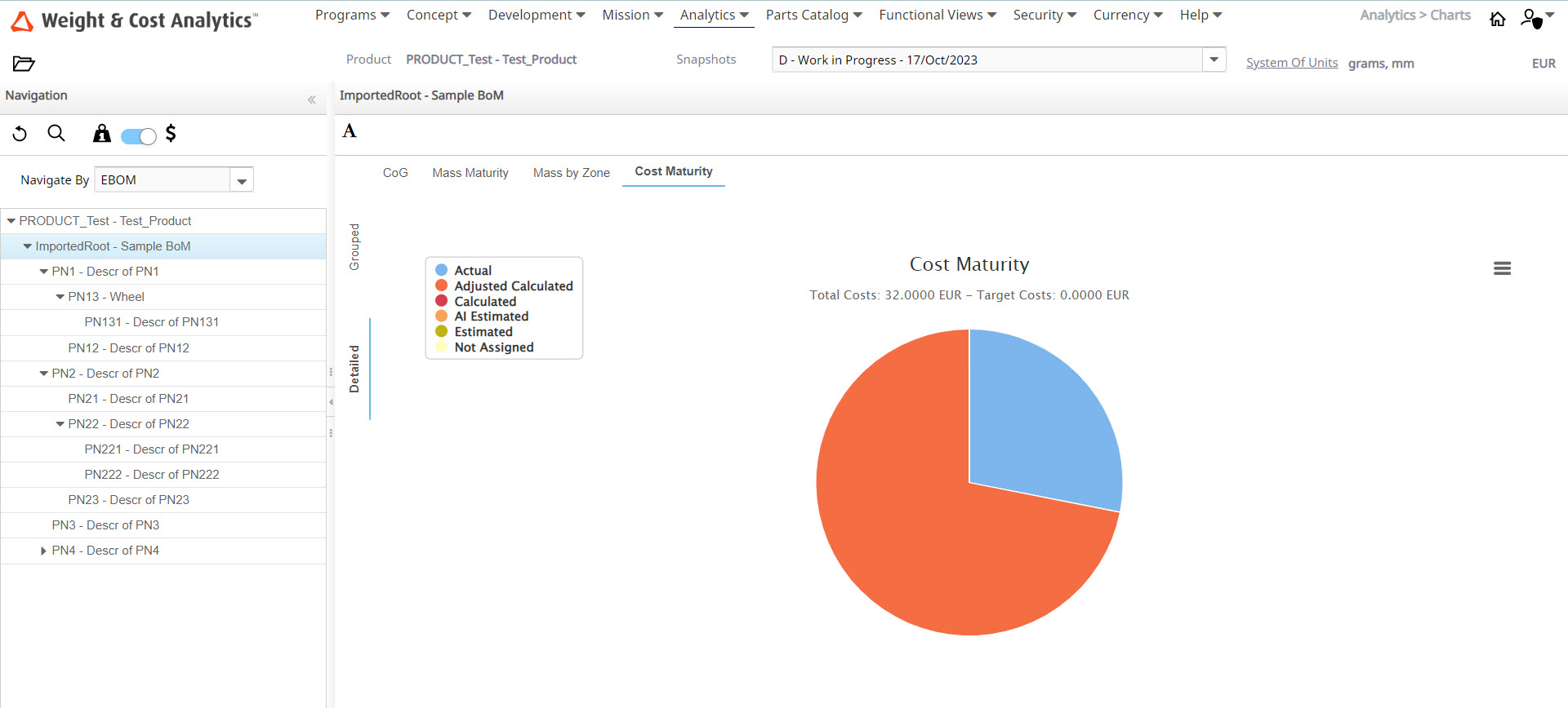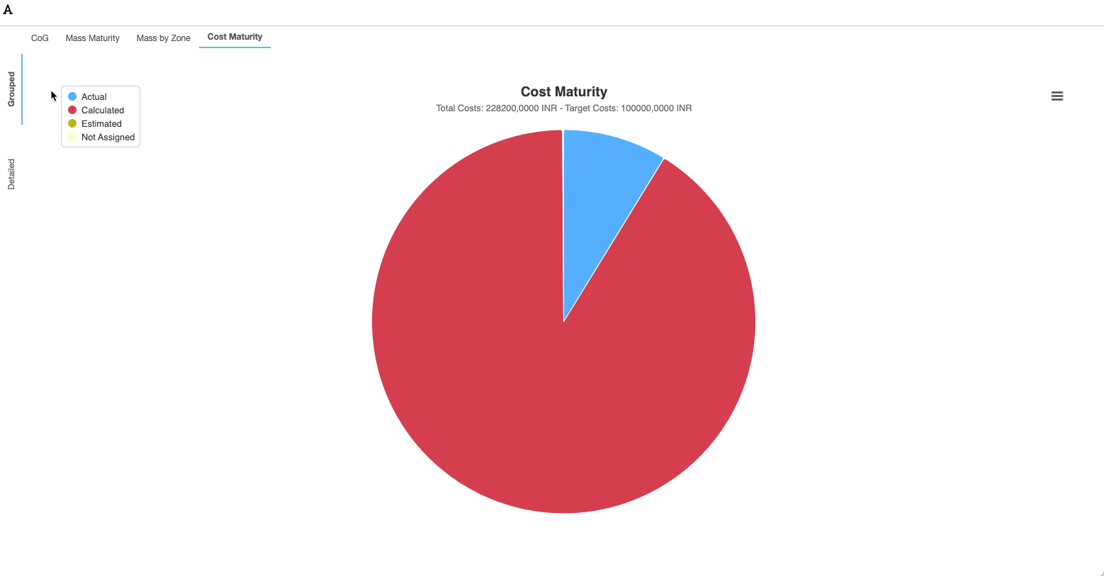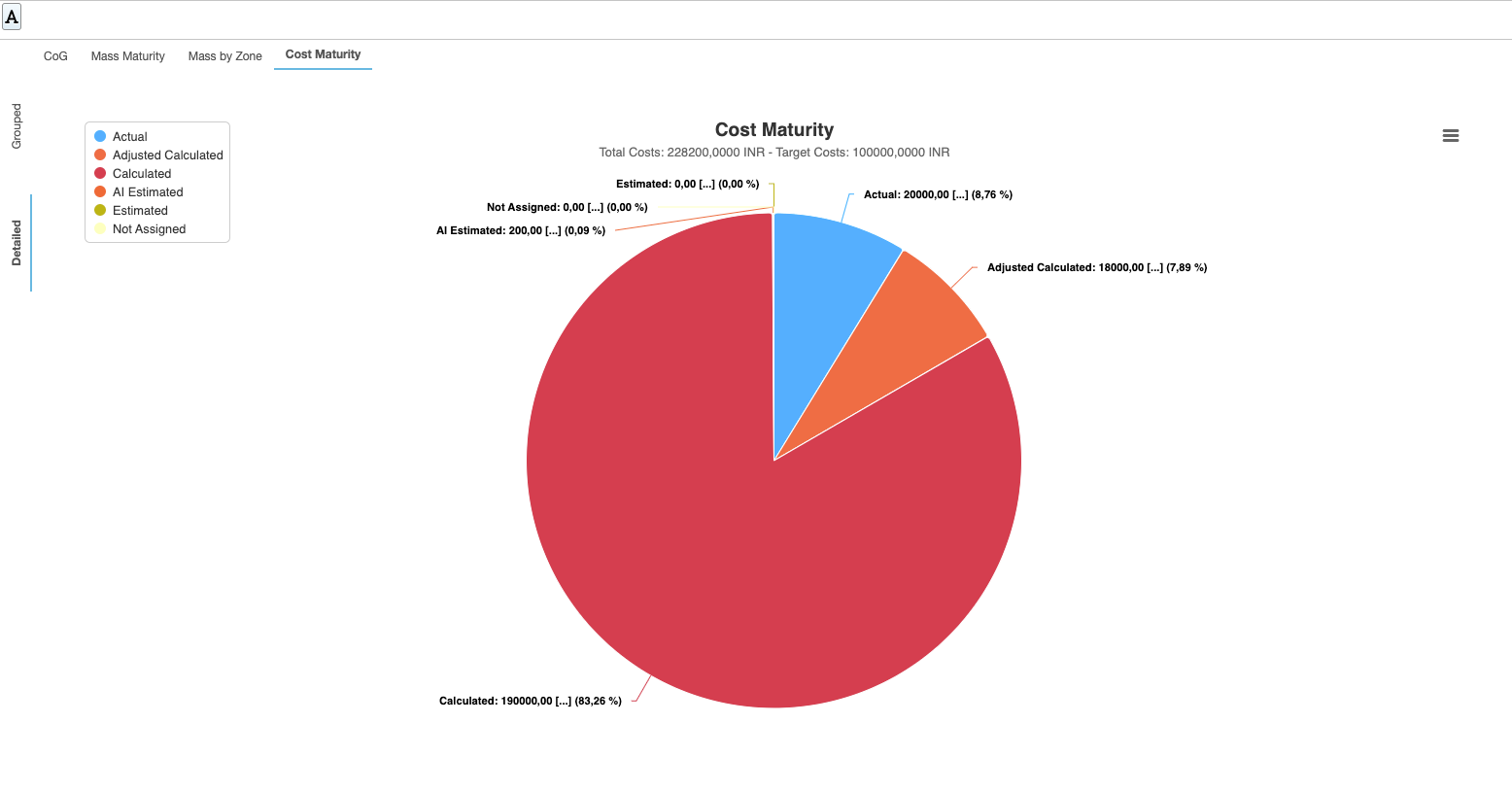 Note: The Cost Maturity view is displayed in the Grouped and Detailed tabs. When the selected Product has managed the margin costs, the Cost Maturity chart displays these views as follows: -