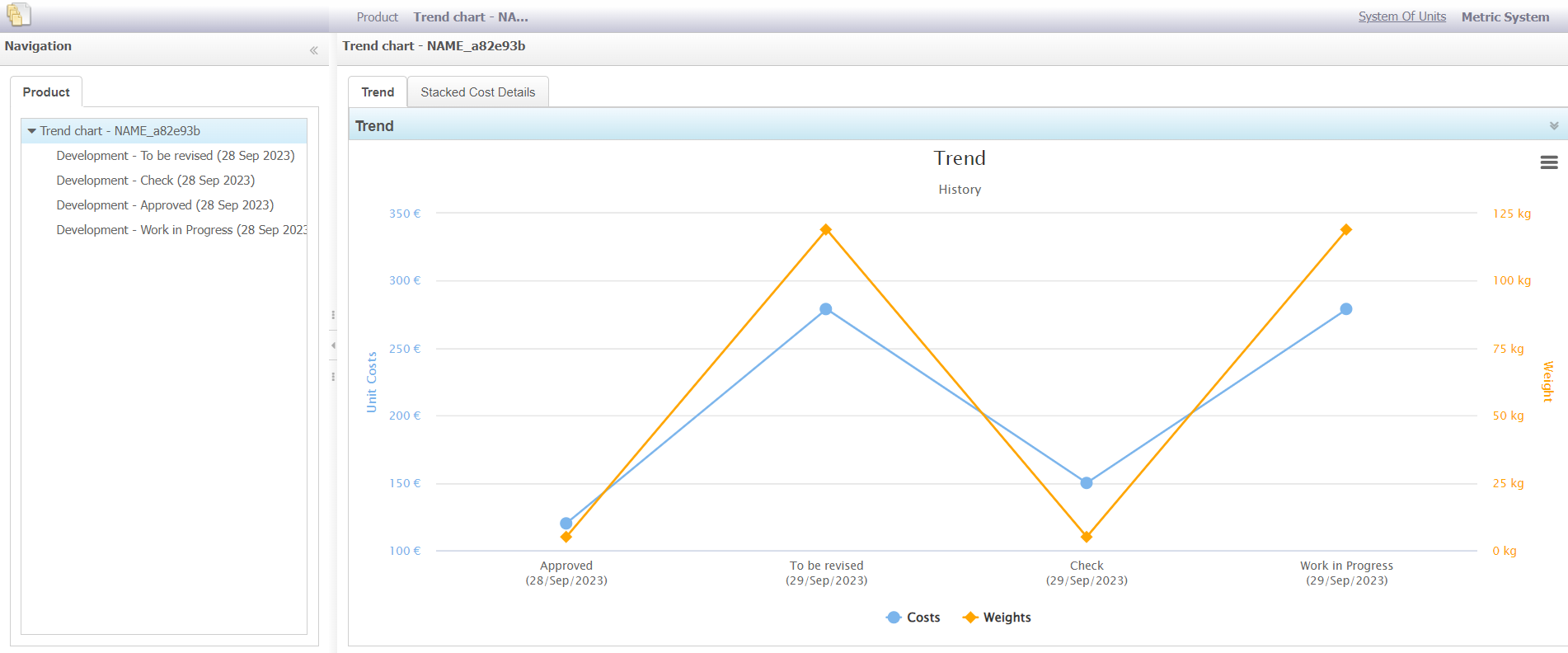 WA shows you the Cost and Weight trends vs Snapshots available in the current product. This analysis allows you to compare