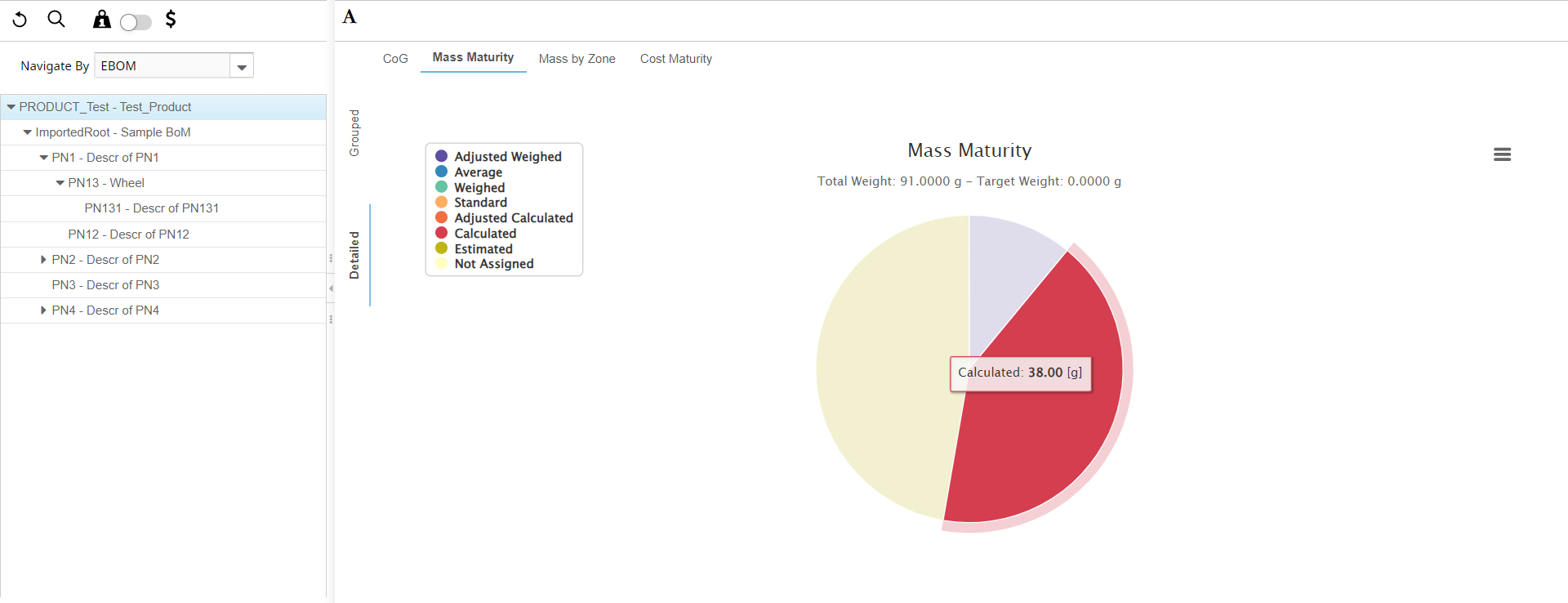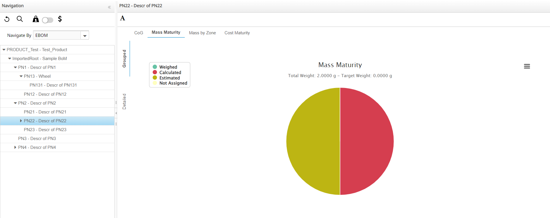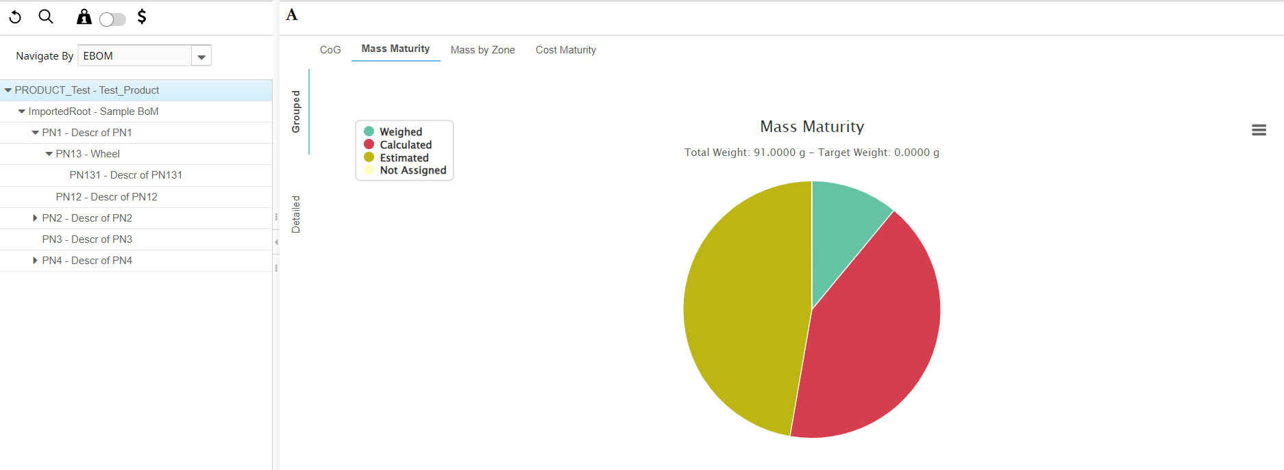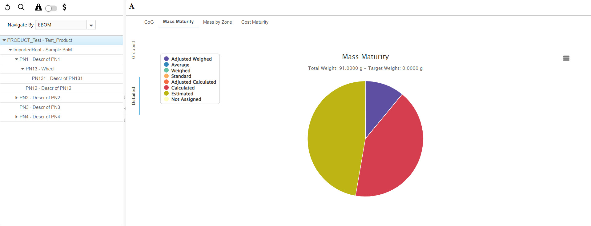 Note: The Mass Maturity view is displayed in the Grouped and Detailed tabs. When the selected Product has managed the margin weights, the Mass Maturity chart displays these views as follows:
