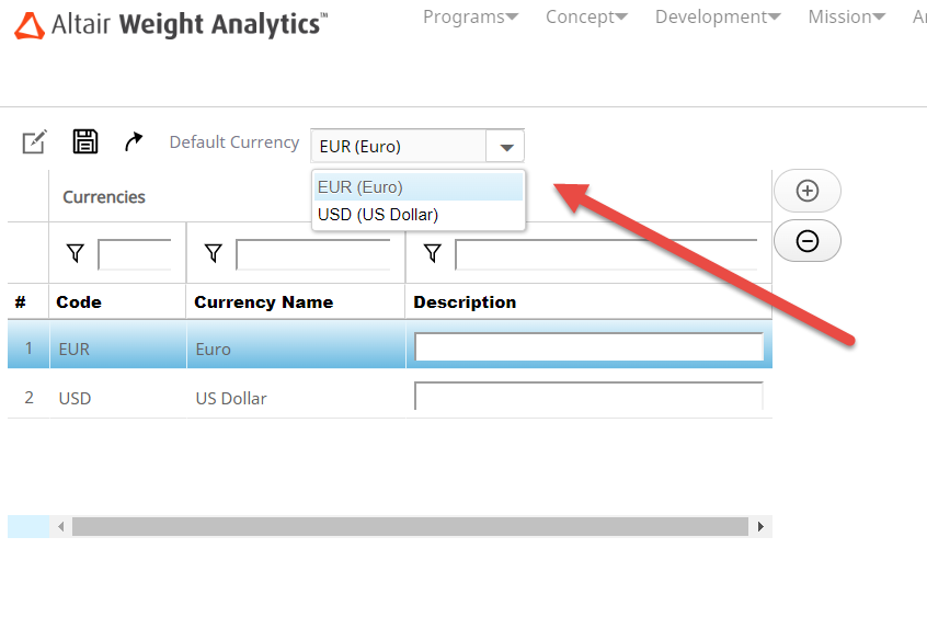 The default currency is indicated in the Currency section of the workspace and is used in WA as a pre-selected currency while creating a Program or as a conversion currency while connecting to Altair's Panopticon. You can use one of the defined currencies as the Default currency.