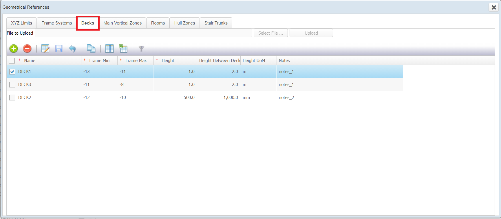 - Define Deck Name, Frame Min, Frame Max, Height, Height between Decks, Height UOM and notes
