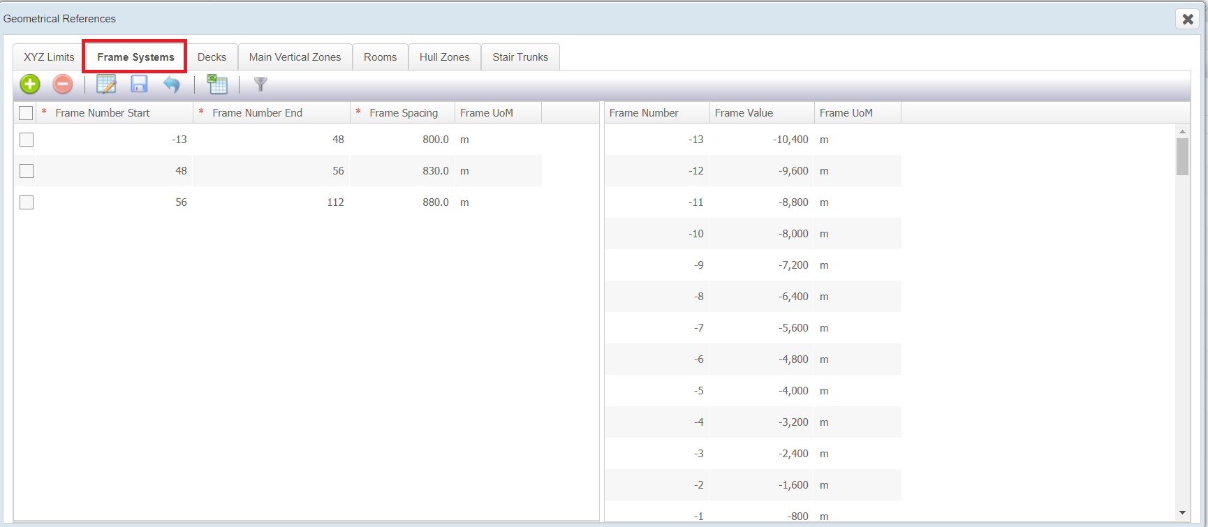 | Frame number start | Frame number end | Frame spacing | From UOM |