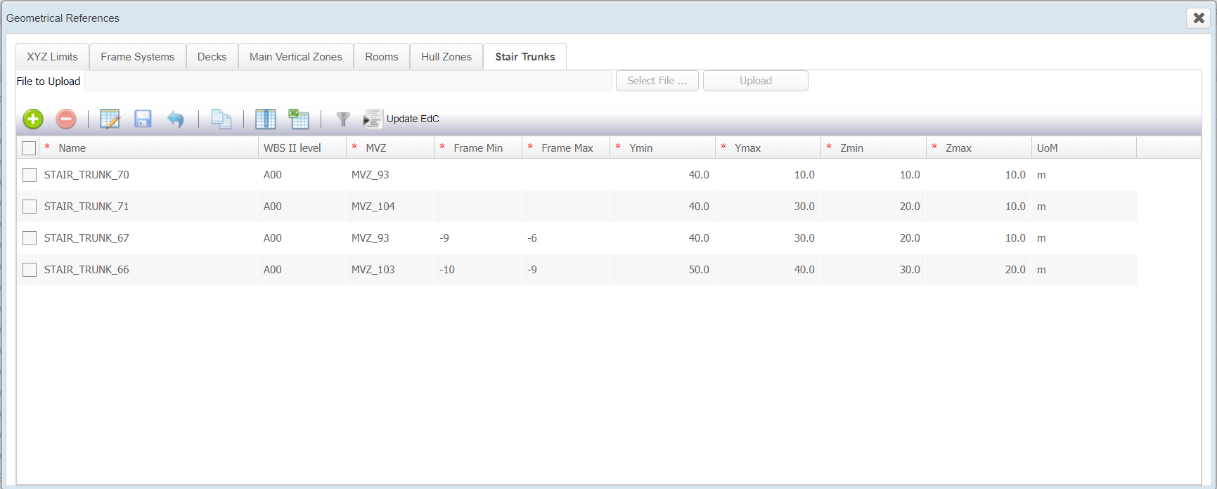 - Define Stair Trunk, WBS II level,MVZ,Frame min,Frame Max,Ymin,Ymax,Zmin,Zmax