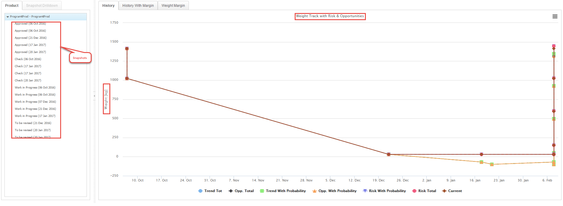 At program level, user can view the overview related to all snapshots. The X-axis shows the time line and Y-axis shows the weight of the product snapshots. These charts enables user to visualise the change in weight, risk and opportunities with respect to time for the selected product.