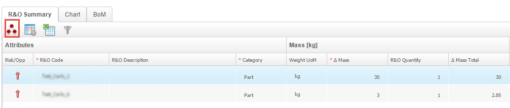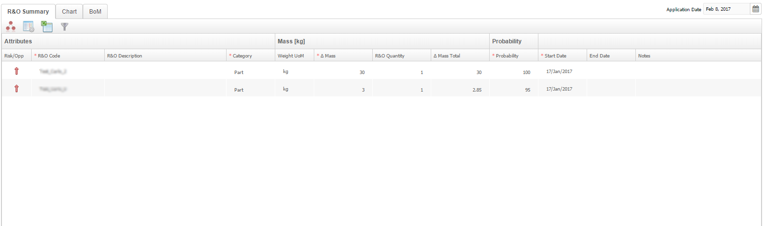 User can view the summary details such as Type (risk or opportunity), Code, Description, Category (product or part), Weight UoM, Mass, R&O Quantity, Mass Total, Probability, Start date, End date and Notes.