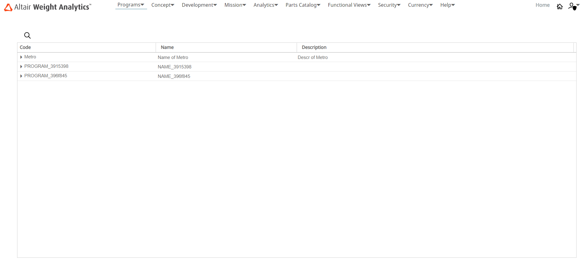 - The Code column displays the Program trees that exist in the database. It also shows the corresponding hierarchy that exists for each program.