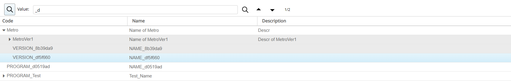 The number of result rows is displayed, and the first row containing the matching search term is highlighted in the table. -